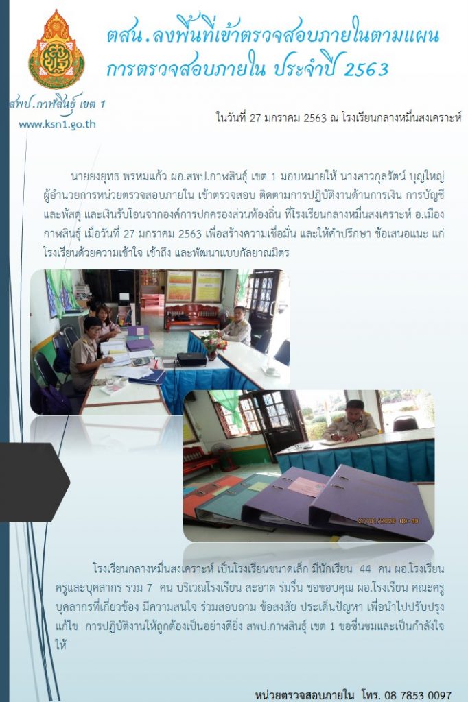 นายยงยุทธ พรหมแก้ว ผอ.สพป.กาฬสินธุ์ เขต 1 มอบหมายให้ นางสาวกุลรัตน์ บุญใหญ่ ผู้อำนวยการหน่วยตรวจสอบภายใน เข้าตรวจสอบ ติดตามการปฏิบัติงานด้านการเงิน การบัญชี และพัสดุ และเงินรับโอนจากองค์การปกครองส่วนท้องถิ่น ที่โรงเรียนกลางหมื่นสงเคราะห์ อ.เมืองกาฬสินธุ์ เมื่อวันที่ 27 มกราคม 2563 เพื่อสร้างความเชื่อมั่น และให้คำปรึกษา ข้อเสนอแนะ แก่โรงเรียนด้วยความเข้าใจ เข้าถึง และพัฒนาแบบกัลยาณมิตร