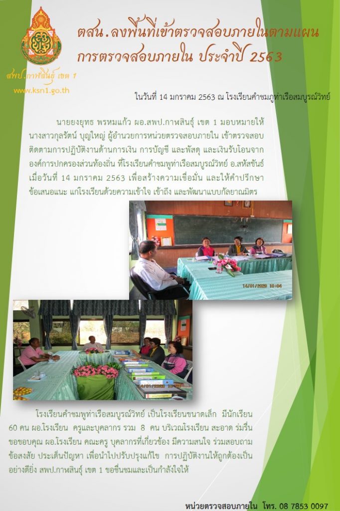 นายยงยุทธ พรหมแก้ว ผอ.สพป.กาฬสินธุ์ เขต 1 มอบหมายให้ นางสาวกุลรัตน์ บุญใหญ่ ผู้อำนวยการหน่วยตรวจสอบภายใน เข้าตรวจสอบ ติดตามการปฏิบัติงานด้านการเงิน การบัญชี และพัสดุ และเงินรับโอนจากองค์การปกครองส่วนท้องถิ่น ที่โรงเรียนคำชมพูท่าเรือสมบูรณ์วิทย์ อ.สหัสขันธ์ เมื่อวันที่ 14 มกราคม 2563 เพื่อสร้างความเชื่อมั่น และให้คำปรึกษา ข้อเสนอแนะ แก่โรงเรียนด้วยความเข้าใจ เข้าถึง และพัฒนาแบบกัลยาณมิตร