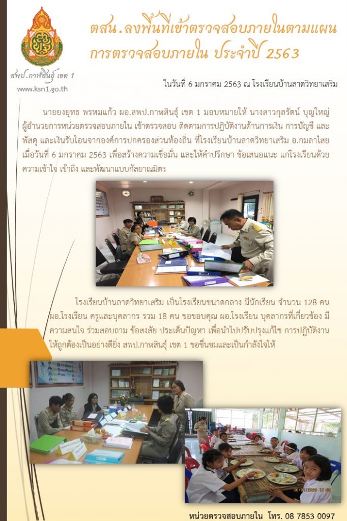 นายยงยุทธ พรหมแก้ว ผอ.สพป.กาฬสินธุ์ เขต 1 มอบหมายให้ นางสาวกุลรัตน์ บุญใหญ่ ผู้อำนวยการหน่วยตรวจสอบภายใน เข้าตรวจสอบ ติดตามการปฏิบัติงานด้านการเงิน การบัญชี และพัสดุ และเงินรับโอนจากองค์การปกครองส่วนท้องถิ่น ที่โรงเรียนบ้านลาดวิทยาเสริม อ.กมลาไสย เมื่อวันที่ 6 มกราคม 2563 เพื่อสร้างความเชื่อมั่น และให้คำปรึกษา ข้อเสนอแนะ แก่โรงเรียนด้วยความเข้าใจ เข้าถึง และพัฒนาแบบกัลยาณมิตร