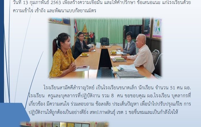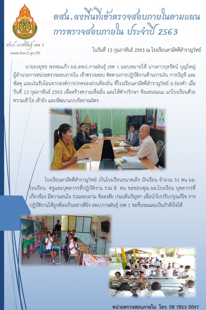 นายยงยุทธ พรหมแก้ว ผอ.สพป.กาฬสินธุ์ เขต 1 มอบหมายให้ นางสาวกุลรัตน์ บุญใหญ่ ผู้อำนวยการหน่วยตรวจสอบภายใน เข้าตรวจสอบ ติดตามการปฏิบัติงานด้านการเงิน การบัญชี และพัสดุ และเงินรับโอนจากองค์การปกครองส่วนท้องถิ่น ที่โรงเรียนสามัคคีสำราญวิทย์ อ.ร่องคำ เมื่อวันที่ 13 กุมภาพันธ์ 2563 เพื่อสร้างความเชื่อมั่น และให้คำปรึกษา ข้อเสนอแนะ แก่โรงเรียนด้วยความเข้าใจ เข้าถึง และพัฒนาแบบกัลยาณมิตร