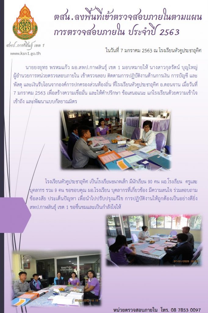 นายยงยุทธ พรหมแก้ว ผอ.สพป.กาฬสินธุ์ เขต 1 มอบหมายให้ นางสาวกุลรัตน์ บุญใหญ่ ผู้อำนวยการหน่วยตรวจสอบภายใน เข้าตรวจสอบ ติดตามการปฏิบัติงานด้านการเงิน การบัญชี และพัสดุ และเงินรับโอนจากองค์การปกครองส่วนท้องถิ่น ที่โรงเรียนหัวคูประชาอุทิศ อ.ดอนจาน เมื่อวันที่ 7 มกราคม 2563 เพื่อสร้างความเชื่อมั่น และให้คำปรึกษา ข้อเสนอแนะ แก่โรงเรียนด้วยความเข้าใจ เข้าถึง และพัฒนาแบบกัลยาณมิตร