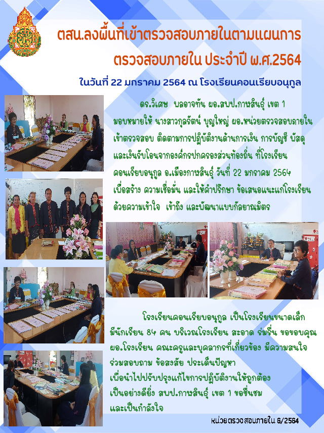 ตสน.ลงพื้นที่เข้าตรวจสอบภายในตามแผนการตรวจสอบภายใน ประจำปี พ.ศ.2564 ในวันที่ 22 มกราคม 2564 ณ โรงเรียนคอนเรียบอนุกูล