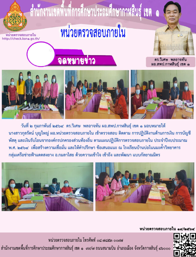วันที่ 2 กุมภาพันธ์ 2564 ดร.วิเศษ พลอาจทัน ผอ.สพป.กาฬสินธุ์ เขต 1 มอบหมายให้ นางสาวกุลรัตน์ บุญใหญ่ ผอ.หน่วยตรวจสอบภายใน เข้าตรวจสอบ ติดตาม การปฏิบัติงานด้านการเงิน การบัญชี พัสดุ และเงินรับโอนจากองค์กรปกครองส่วนท้องถิ่น ตามแผนปฏิบัติการตรวจสอบภายใน ประจำปีงบประมาณ พ.ศ. 2564 เพื่อสร้างความเชื่อมั่น และให้คำปรึกษา ข้อเสนอแนะ ณ โรงเรียนบ้านบ่อโนนมะค้ำวิทยาคาร กลุ่มเครือข่ายฟ้าแดดสงยาง อ.กมลาไสย ด้วยความเข้าใจ เข้าถึง และพัฒนา แบบกัลยาณมิตร