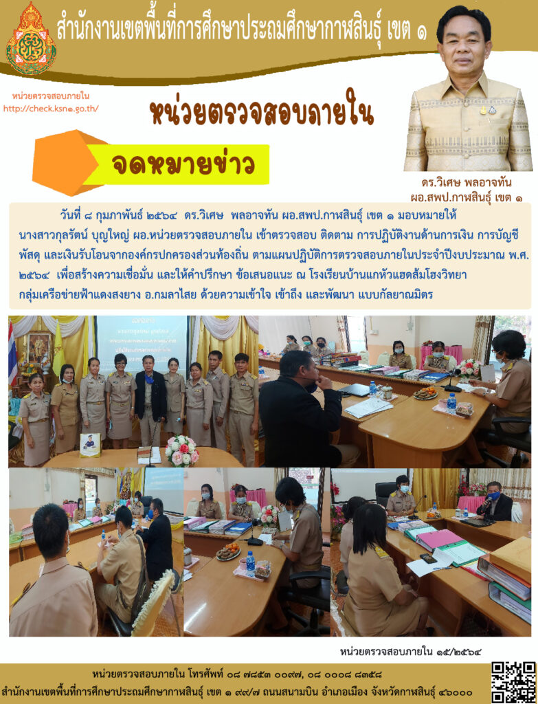 วันที่ 8 กุมภาพันธ์ 2564 ดร.วิเศษ พลอาจทัน ผอ.สพป.กาฬสินธุ์ เขต 1 มอบหมายให้ นางสาวกุลรัตน์ บุญใหญ่ ผอ.หน่วยตรวจสอบภายใน เข้าตรวจสอบ ติดตาม การปฏิบัติงานด้านการเงิน การบัญชี พัสดุ และเงินรับโอนจากองค์กรปกครองส่วนท้องถิ่น ตามแผนปฏิบัติการตรวจสอบภายในประจำปีงบประมาณ พ.ศ. 2564 เพื่อสร้างความเชื่อมั่น และให้คำปรึกษา ข้อเสนอแนะ ณ โรงเรียนบ้านแกหัวแฮดส้มโฮงวิทยา กลุ่มเครือข่ายฟ้าแดงสงยาง อ.กมลาไสย ด้วยความเข้าใจ เข้าถึง และพัฒนา แบบกัลยาณมิตร