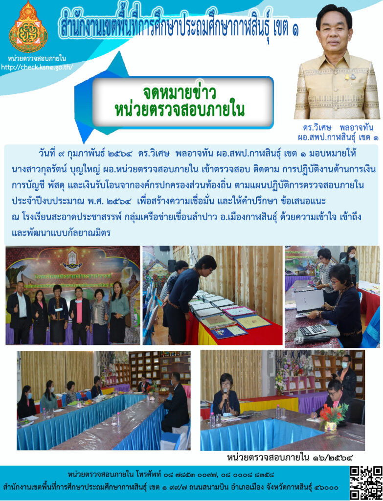 วันที่ 9 กุมภาพันธ์ 2564 ดร.วิเศษ พลอาจทัน ผอ.สพป.กาฬสินธุ์ เขต 1 มอบหมายให้ นางสาวกุลรัตน์ บุญใหญ่ ผอ.หน่วยตรวจสอบภายใน เข้าตรวจสอบ ติดตาม การปฏิบัติงานด้านการเงิน การบัญชี พัสดุ และเงินรับโอนจากองค์กรปกครองส่วนท้องถิ่น ตามแผนปฏิบัติการตรวจสอบภายใน ประจำปีงบประมาณ พ.ศ. 2564 เพื่อสร้างความเชื่อมั่น และให้คำปรึกษา ข้อเสนอแนะณ โรงเรียนสะอาดประชาสรรพ์ กลุ่มเครือข่ายเขื่อนลำปาว อ.เมืองกาฬสินธุ์ ด้วยความเข้าใจ เข้าถึง และพัฒนาแบบกัลยาณมิตร